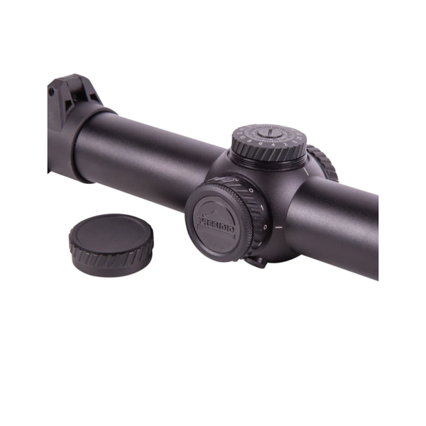 Tem certificação IP67 de resistência à água e poeira, o Presidio é ideal para uma variedade de armas de fogo, incluindo rifles de assalto AR e rifles de ferrolho. O Presidio 1-6×24 HDR inclui tampas de lente retráteis, uma alavanca de arremesso prática e uma bateria CR2032.